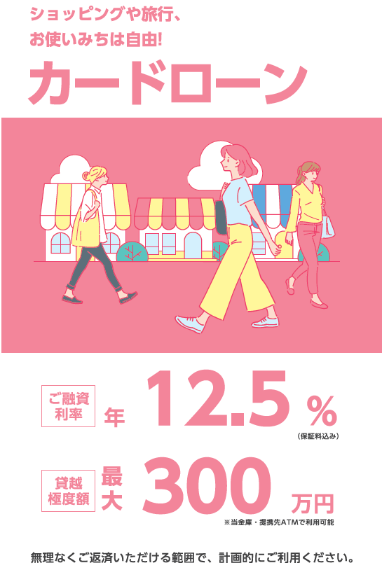 | ご利用方法 | 専用のローンカードが発行されます。当金庫または提携金融機関のATMでご利用いただけます。 | ||||||||||||||