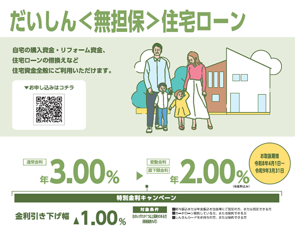 固定金利(10年以内)通常金利 年3.95% → 固定金利(10年以内)/最下限金利 年2.95%(保証料込) 固定金利(20年以内)通常金利 年4.45% → 固定金利(20年以内)/最下限金利 年3.45%(保証料込) |